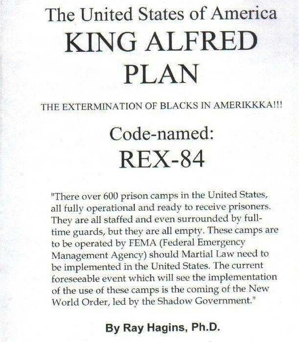 The King Alfred Plan was understood to be a government plan in the 1960s to detain and intern African Americans in the event of a major civil unrest. Rex-84 was a government exercise in the 1980s to test the readiness of the federal government to detain large numbers of American citizens in case of a national emergency.
